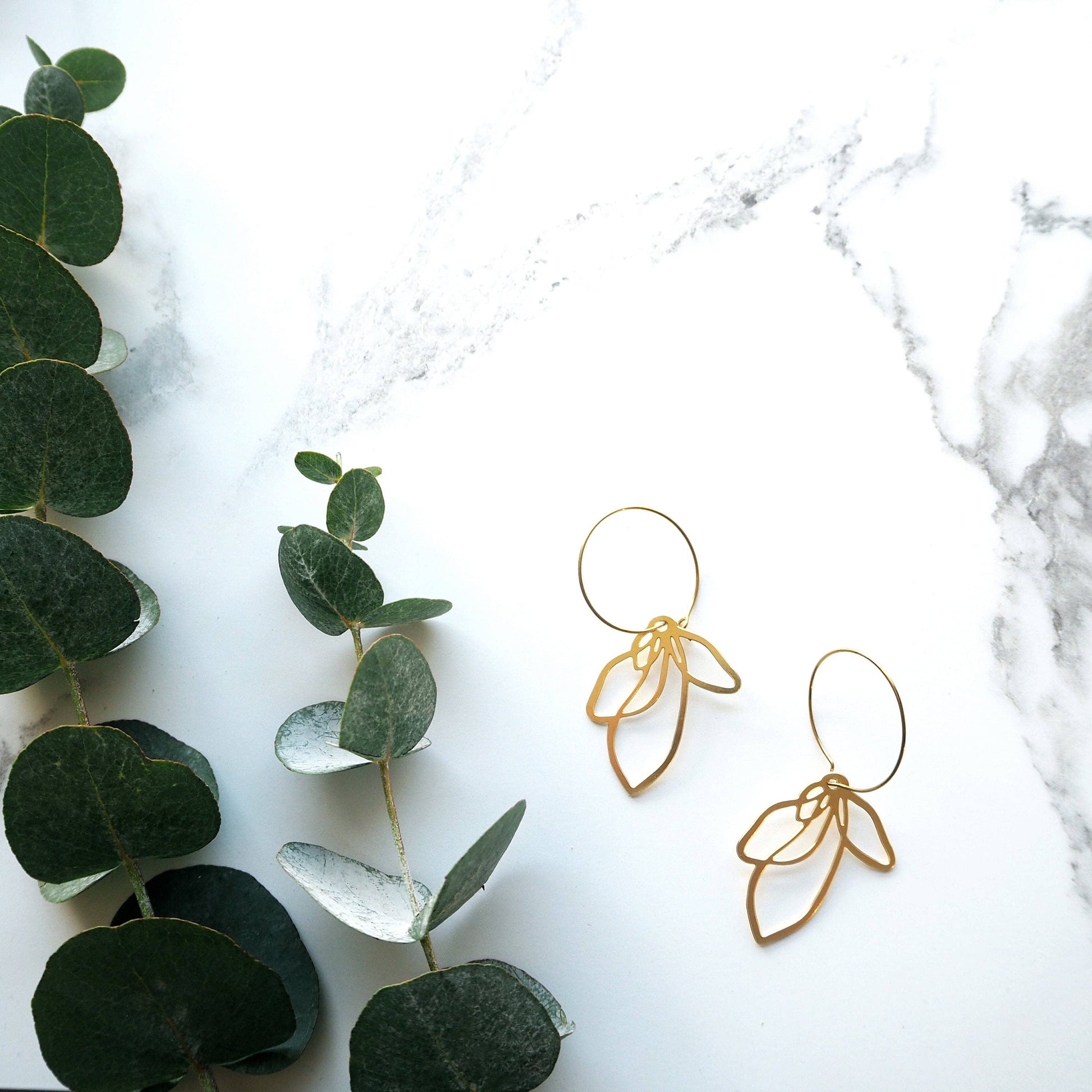 Diese leichten Ohrringe messen 3,5 cm und hängen an einem 2,5 cm großen Ring. Hergestellt aus lasergeschnittenem, nickelfreiem Messing, beschichtet mit einer schönen mattgoldenen Oberfläche. Alle Metallfunde sind hypoallergen.