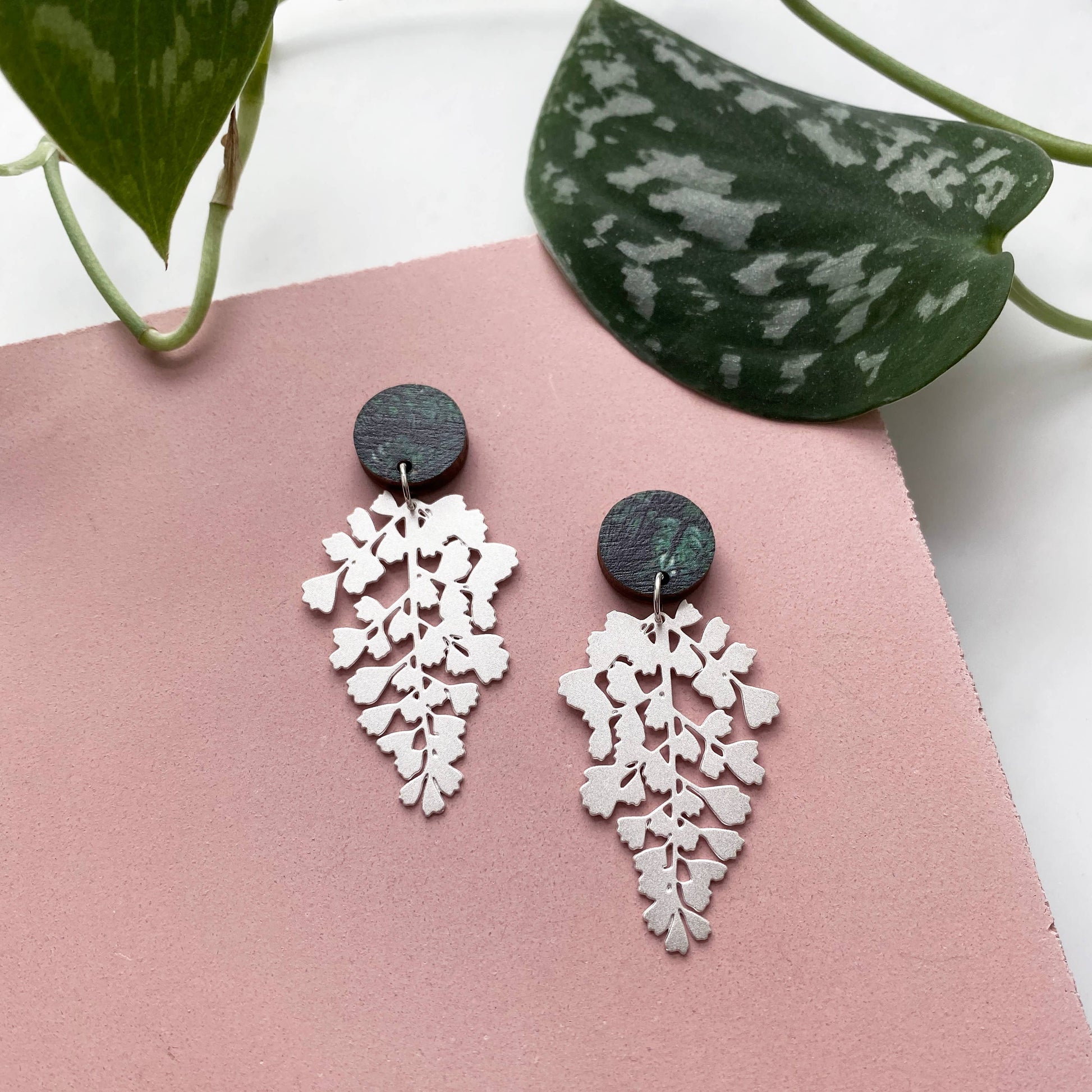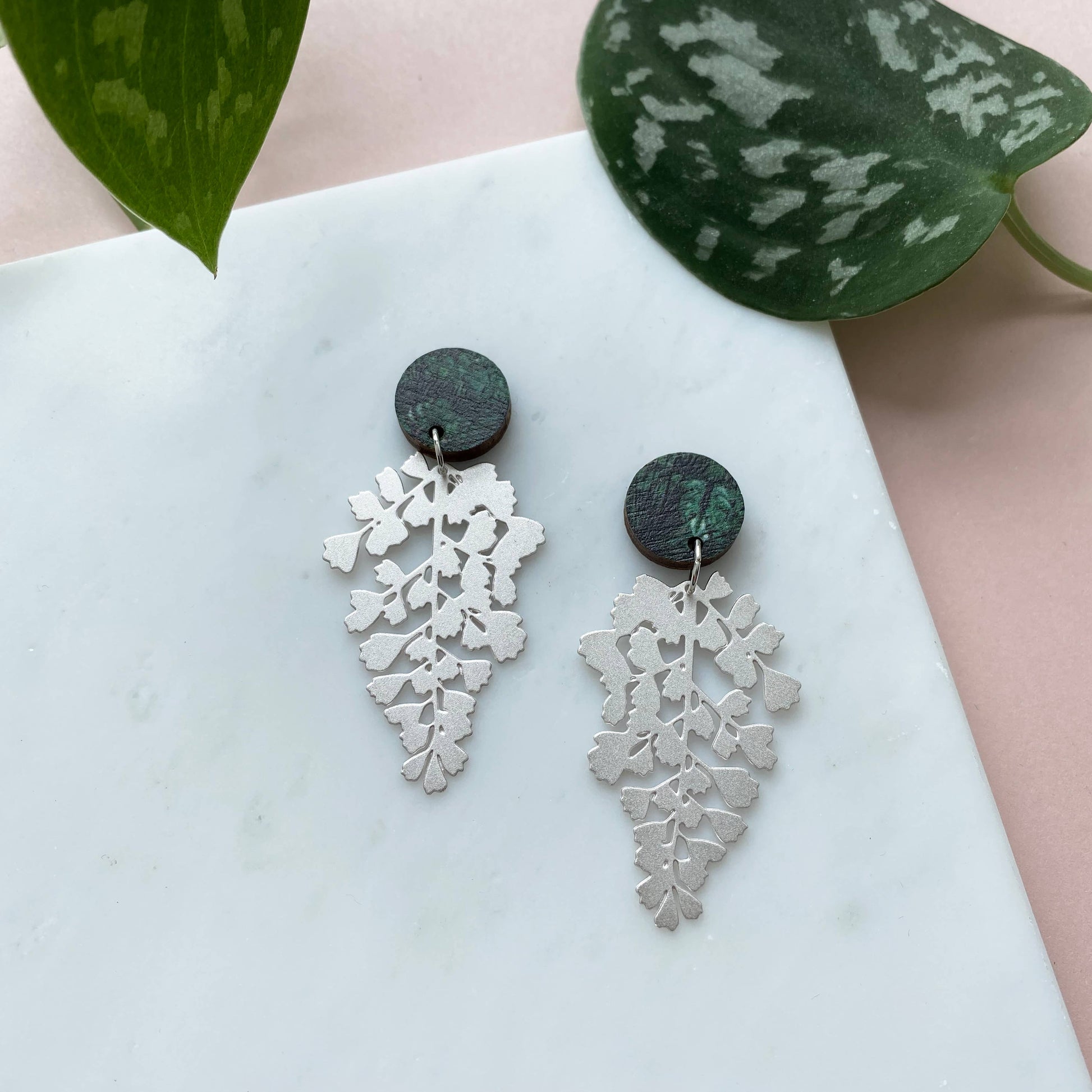 Diese leichten Ohrringe messen 6 cm und der Kreis misst 1,5 cm Das Blattteil besteht aus lasergeschnittenem, nickelfreiem Messing, das mit einer schönen mattsilbernen Oberfläche beschichtet ist, und der Kreis besteht aus hochwertigem, digital bedrucktem, FSC-zertifiziertem 3-mm-Sperrholz, das mit einem Laserschneider geschnitten und auf der Rückseite schwarz lackiert wurde.