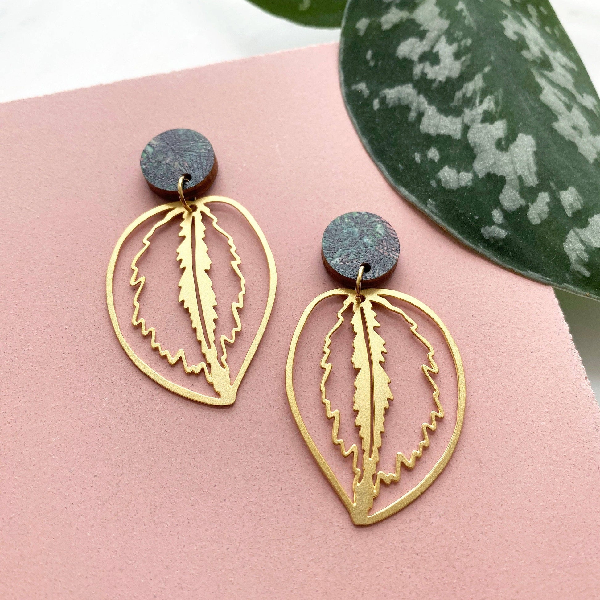 Diese leichten Ohrringe messen 4 cm und der Kreis misst 1,5 cm Das Blattteil besteht aus lasergeschnittenem, nickelfreiem Messing, das mit einer schönen mattgoldenen Oberfläche beschichtet ist, und der Kreis besteht aus hochwertigem, digital bedrucktem, FSC-zertifiziertem 3-mm-Sperrholz, das mit einem Laserschneider geschnitten und auf der Rückseite schwarz lackiert wurde.
